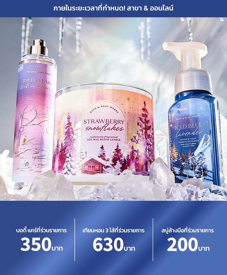 Bath and Body Works คือสถานที่ที่คุณไป ของขวัญ และสารพัดที่สร้างความประหลาดใจและความสุข เราค้นพบตั้งแต่กลิ่นหอมสดชื่นไปจนถึงการดูแลผิวที่ผ่อนคลาย มอบประสบการณ์พิเศษแห่งความทรงจำอันแสนสุขให้กับคุณ โอ้! และในขณะที่คุณกำลังท่องเว็บ ให้เลือกซื้อตัวเลือกใหม่ล่าสุดและยิ่งใหญ่ที่สุดของเรา โลชั่น, สบู่ล้างมือ และ เทียน!