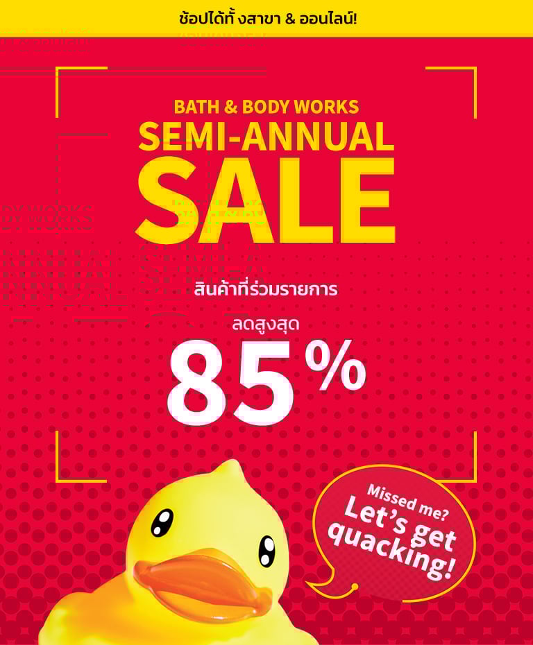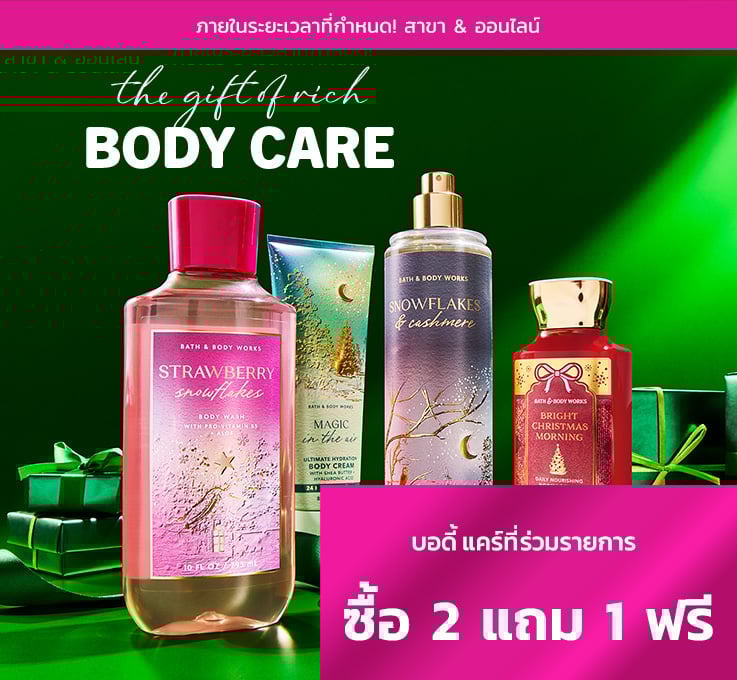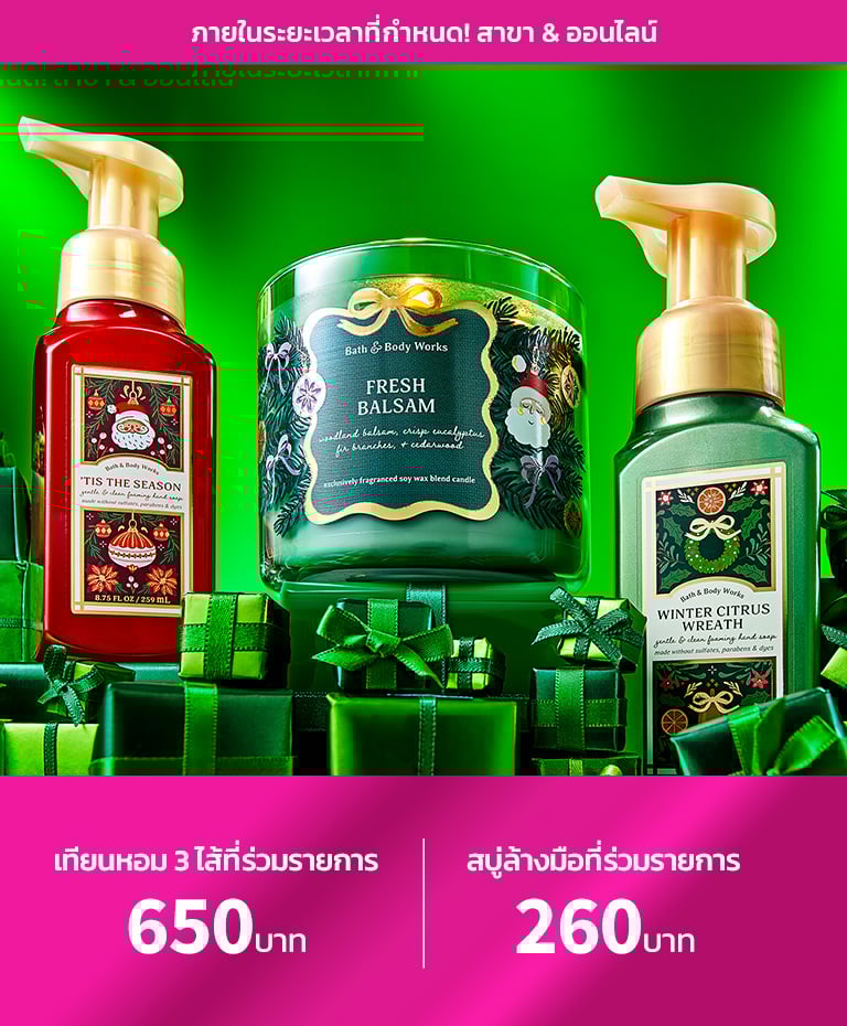 Bath and Body Works คือสถานที่ที่คุณไป ของขวัญ และสารพัดที่สร้างความประหลาดใจและความสุข เราค้นพบตั้งแต่กลิ่นหอมสดชื่นไปจนถึงการดูแลผิวที่ผ่อนคลาย มอบประสบการณ์พิเศษแห่งความทรงจำอันแสนสุขให้กับคุณ โอ้! และในขณะที่คุณกำลังท่องเว็บ ให้เลือกซื้อตัวเลือกใหม่ล่าสุดและยิ่งใหญ่ที่สุดของเรา โลชั่น, สบู่ล้างมือ และ เทียน!